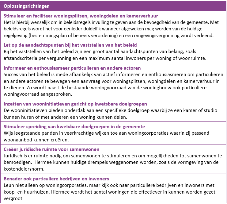 Als er al passende woningen beschikbaar zijn, zijn deze vaak niet inzetbaar voor mogelijkheden zoals woningdelen, woningsplitsen, kamerverhuur en wooninitiatieven (zoals Kamers met Aandacht of Parentshouses). Dit komt ten eerste door stringente regelgeving. De bestemmingsplannen bevatten vaak strikte regels omtrent het verbouwen van een woning tot meerdere woningen of woonruimtes en het delen van woonruimtes door mensen die gezamenlijk geen huishouden vormen. Ten tweede brengt het huisvesten van meerdere personen in een woning planologische problematiek met zich mee zoals parkeeroverlast en verstening bij het realiseren van meer woonruimte (schuurtjes, uitbouwen en dakkapellen). Dit kan leiden tot ophef en weerstand van buurtgenoten, hetgeen een politieke drempel kan vormen om dergelijke wooninitiatieven wel of niet toe te staan.